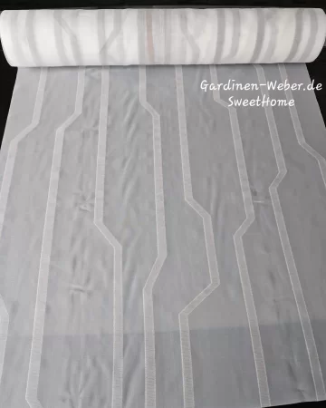 Schiebevorhang modern mit Alupaneelwagen und Beschwerungsstange. Seitenkante thermisch geschnitten. Geeignet für alle gängigen Gardinenschienen. Maßen: Höhe ca. 245 cm. Breite ca. 60 cm. Stoff: 100% Polyester, Voile. Muster: Grafik. Farbe: wollweiß. Waschen: Pflegeleicht 30°. Nach Wunsch kann gekürzt werden, beim Kauf Notiz hinterlassen!