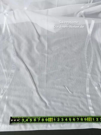 Voile Mit Bleiband. Qualität - Mischgewebe transparent. Farbe-weiß. Muster -Welle, vertikal, Rapport horizontal ca. 20 cm. (Abstand zwischen Wellen) Breite: - 300 cm. Pflege: - waschbar bis 30 Grad. Der Preis bezieht sich auf 1 Laufender Meter mit 300 cm. Breite (keine fertige Gardine!) Wenn Sie beispielweise Menge 5 bestellen, erhalten Sie 5 laufende Meter am Stück.