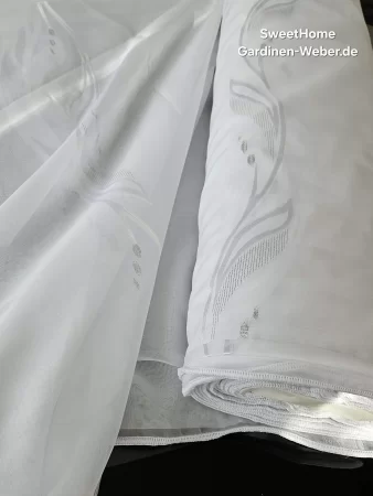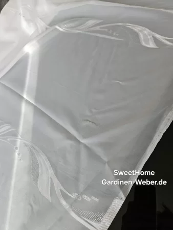Voile Mit Bleiband. Qualität - Mischgewebe transparent. Farbe-weiß. Muster -Welle/Blume, vertikal, Rapport horizontal ca. 35 cm. (Abstand zwischen Wellen) Breite: - 300 cm. Pflege: - waschbar bis 30 Grad. Der Preis bezieht sich auf 1 Laufender Meter mit 300 cm. Breite (keine fertige Gardine!) Wenn Sie beispielweise Menge 5 bestellen, erhalten Sie 5 laufende Meter am Stück mit Breite 3m.