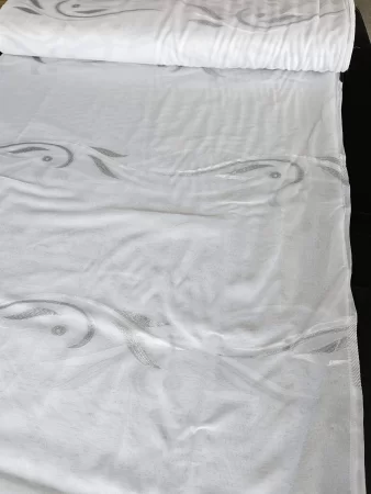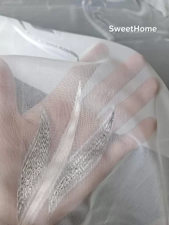 Voile Mit Bleiband. Qualität - Mischgewebe transparent. Farbe-weiß/silber Glitzer. Muster -Blume, vertikal, Rapport ca. 22 cm. Breite: - 300 cm. Pflege: - waschbar bis 30 Grad. Der Preis bezieht sich auf 1 Laufender Meter mit 300 cm. Breite (keine fertige Gardine!) Wenn Sie beispielweise Menge 5 bestellen, erhalten Sie 5 laufende Meter am Stück mit Breite 3m.