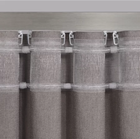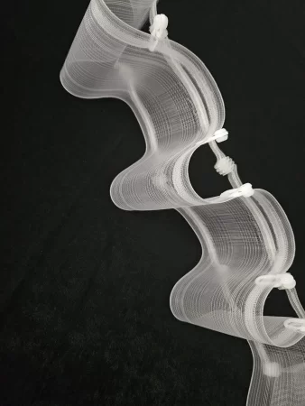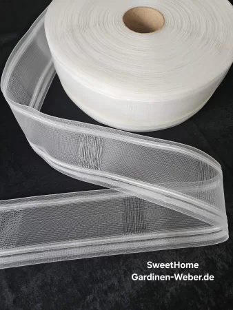 Universal Wellenband mit Steg für Stange, oder für Schiene. Breite: 10 cm. Farbe: transparent. Stoffverhältnis: 1:2,5 (250%) Faltenanzahl: 1 Faltentiefe: 6,5-7 cm. Rapport: 20 cm. Taschenreihen :1 Zugschnüre: 2 Material: Polyester. Hersteller Fa. Gerster Preis/Einheit- 1 m. Artikelnummer: 6961 Beispiel: Schiene 2 m. breit. Formel: 2x2,5=5 m. Für 5 m. Stoff- 5 m. (Einheiten) Wellenband kaufen. Maßgeschneiderte Ware ist vom Umtausch ausgeschlossen!